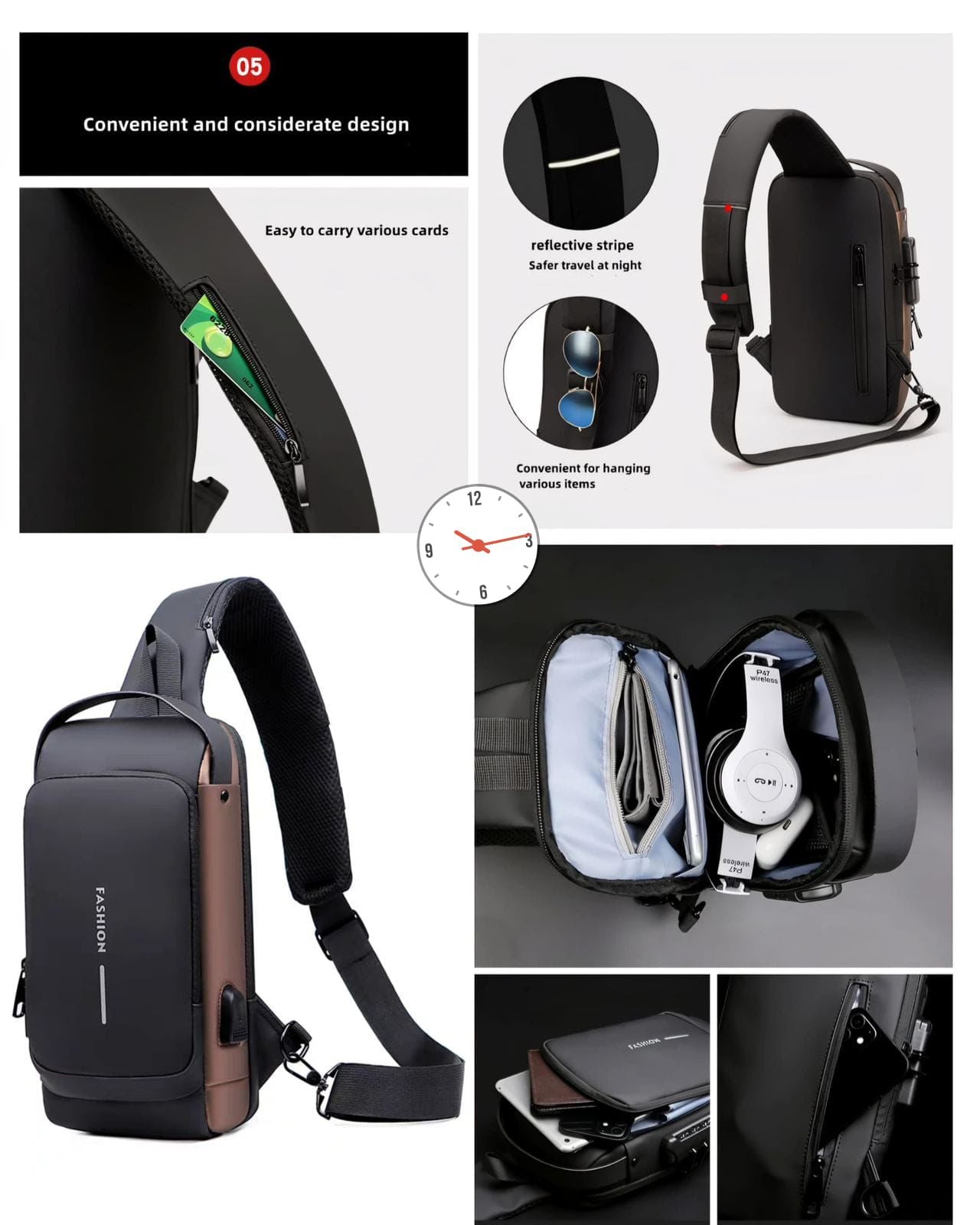Despite its sleek size, the bag fits your tablet, phone, wallet, power bank, water bottle, sunglasses, and umbrella — all organized neatly in multiple compartments.